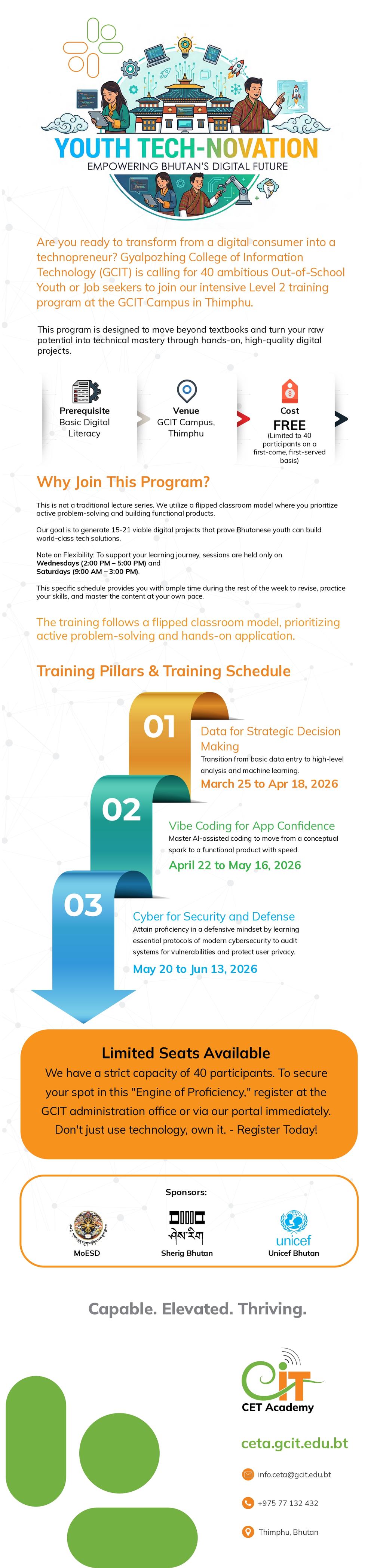 calendar_monthMarch 28, 2026Applications are still open for the Youth Tech-novation Training at Gyalpozhing College of Information Technology until Tuesday, March 31, 2026!